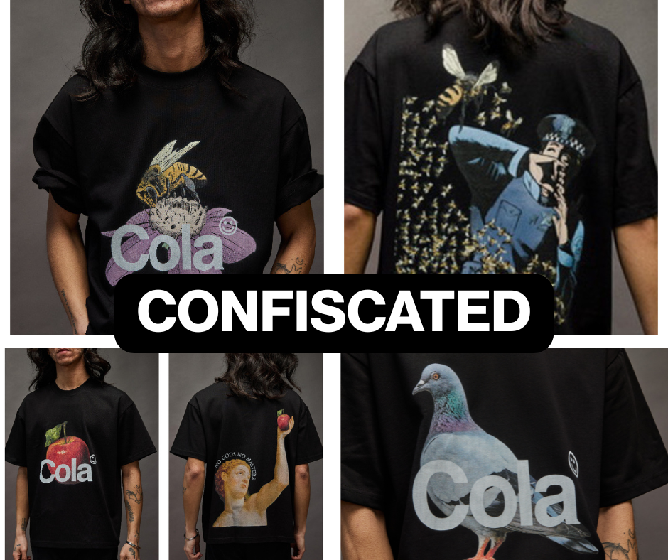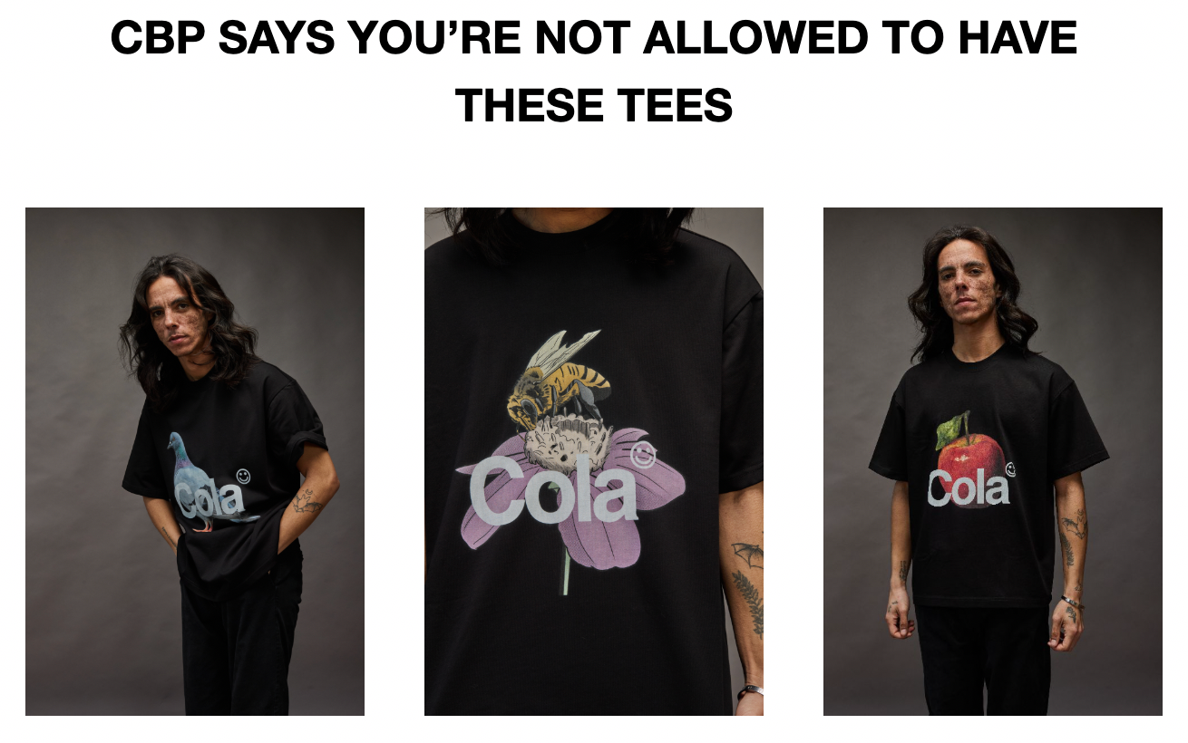 Customs and Border Protection (CBP) recently confiscated a shipment of Cola tees at O’Hare airport, using a 100% bogus copyright claim. In essence, CBP refused to accept that I own the Cola logo. At 5:20pm on Tuesday, a customs broker emailed CBP with proof of ownership, requesting the release of my property. Ten minutes later CBP responded with a new rationalization for their theft, namely, that the garments lacked tags declaring country of origin.
