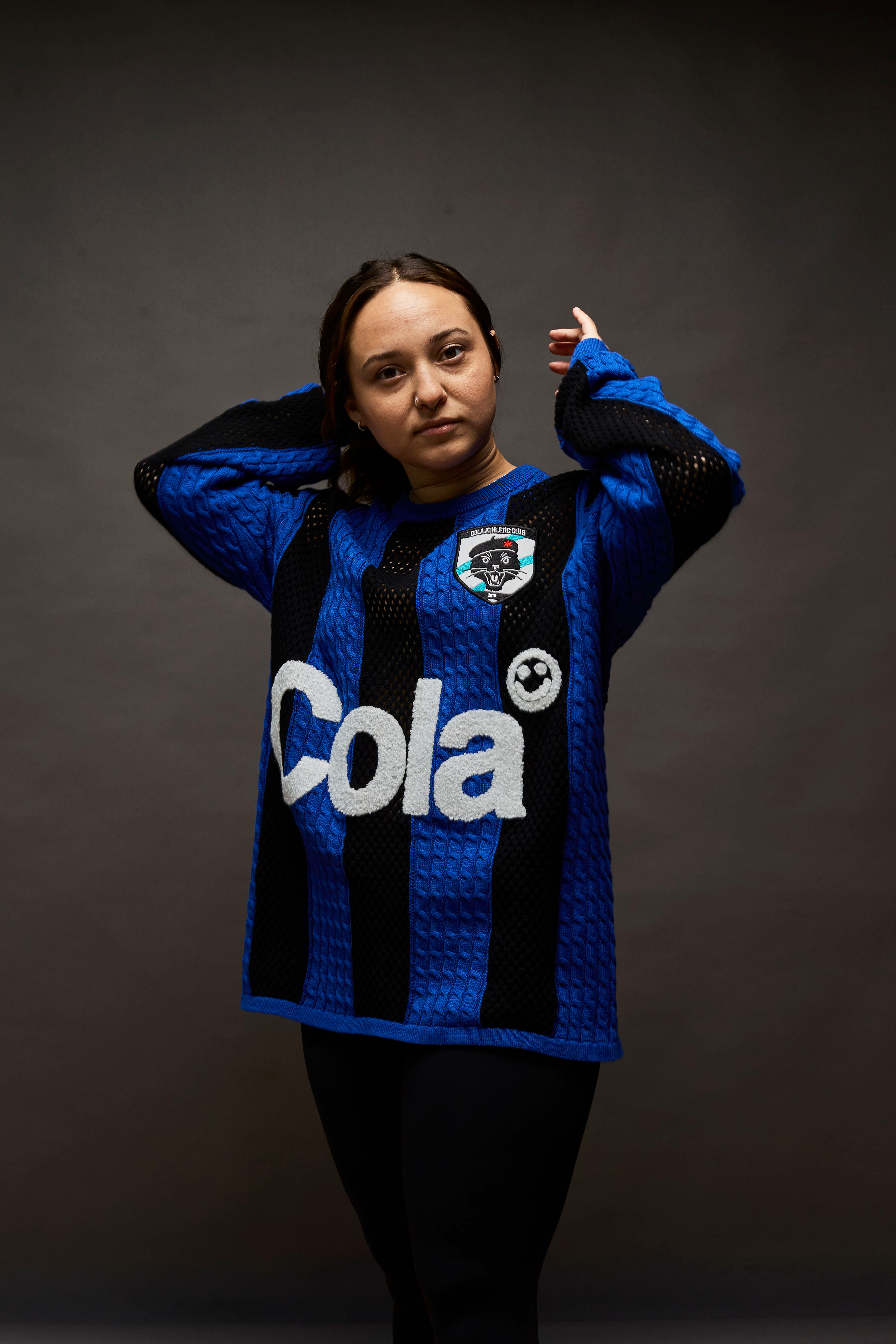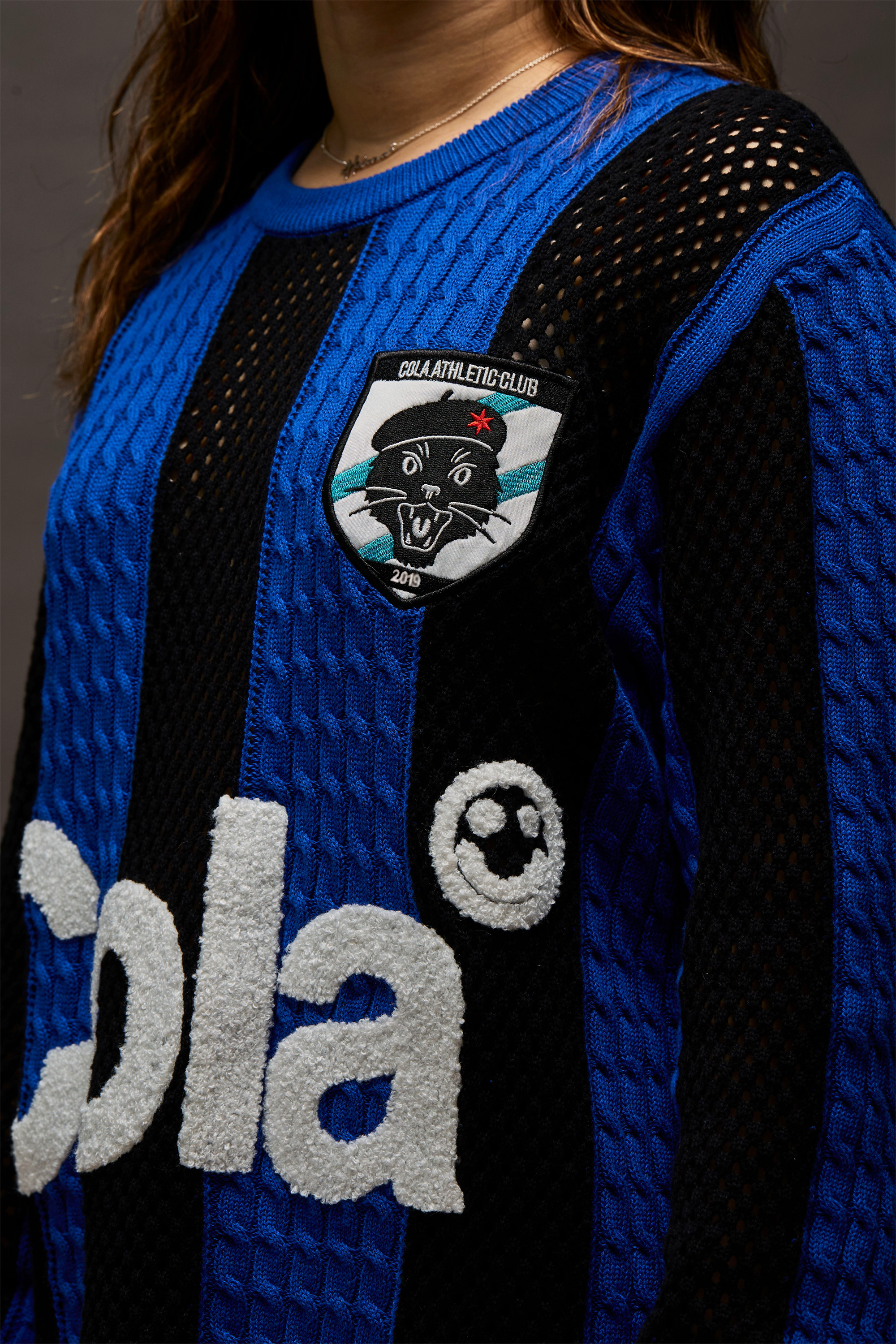 I worked with the same factory that made the 1A sweater to create a knit soccer jersey / sweater. Based on the iconic Inter Milan shirt, my jersey has alternating cable knit panels in a beautiful blue, and hollow knit panels in black. Jean Paul once again appears, this time on the team crest. On the right sleeve, I riffed on the patches that soccer players wore in the English Premier League during the 1990s, substituting a lion with a calico cat, in honor of our girls Mary and Rose.